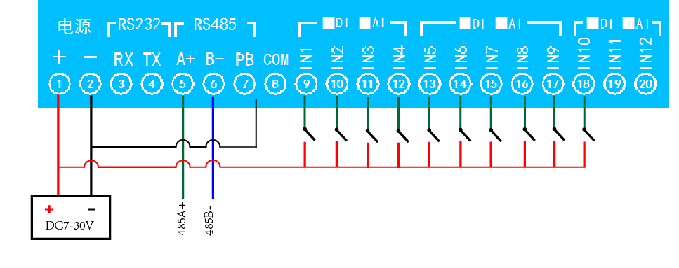電腦自帶的串口一般是RS232,需要配232-485轉換器(工業環境建議使用有源帶隔離的轉換器),轉換后RS485為A、B兩線,A接板上A端子,B接板上B端子,485屏蔽可以接GND。若設備比較多建議采用雙絞屏蔽線,采用鏈型網絡結構。