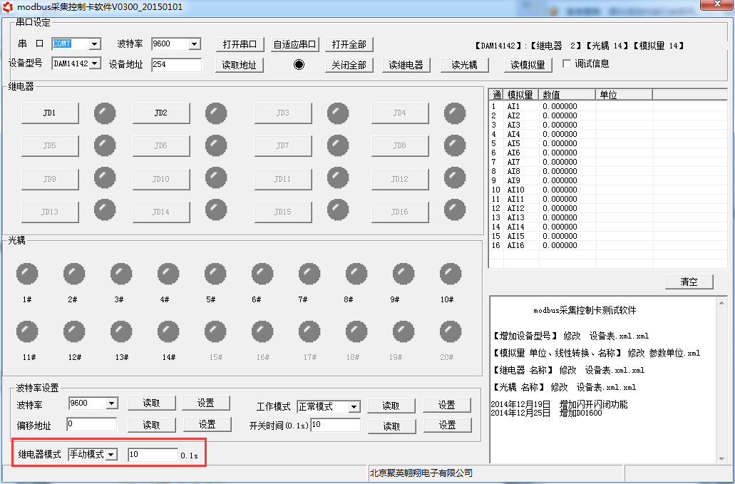 打開“聚英翱翔DAM調試軟件”;串口設定欄:串口選擇您電腦對應COM口,波特率選擇設備默認波特率(9600)(未自己設置過波特率前),設備地址填寫“254”(254為設備的廣播地址),設備型號選擇相對應型號,設置好以上設備的4個參數后點擊打開串口,點擊繼電器按鈕“JD1”若繼電器反應則連接成功。