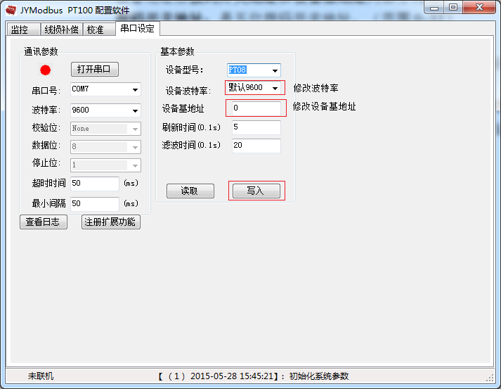 打開(kāi)采集配置軟件,選擇串口設(shè)定菜單,在通訊參數(shù)中點(diǎn)擊關(guān)閉串口,選擇相應(yīng)的串口號(hào)和波特率(默認(rèn)9600),超時(shí)時(shí)間最小間隔都改成50ms。基本參數(shù)中設(shè)備型號(hào)選擇PT08。點(diǎn)擊打開(kāi)串口 ,點(diǎn)擊 讀取 按鈕,在下邊信息欄中顯示讀取成功,則表示聯(lián)機(jī)成功,(若顯示通信失敗,請(qǐng)確定串口接線,串口號(hào),波特率和地址是否正確)。