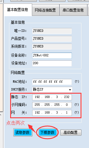 在“基本配置信息”欄內,修改設備IP為靜態IP,與電腦所處網段為同一網段,點擊“下載參數”,2S后再點擊“下載參數”,提示配置成功。