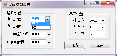 ②、根據(jù)當(dāng)前設(shè)備選擇串口或TCP通訊方式,點(diǎn)擊保存,(注:TCP通訊方式下,僅設(shè)備的工作模式為TCP Server,即設(shè)備作為Server端)