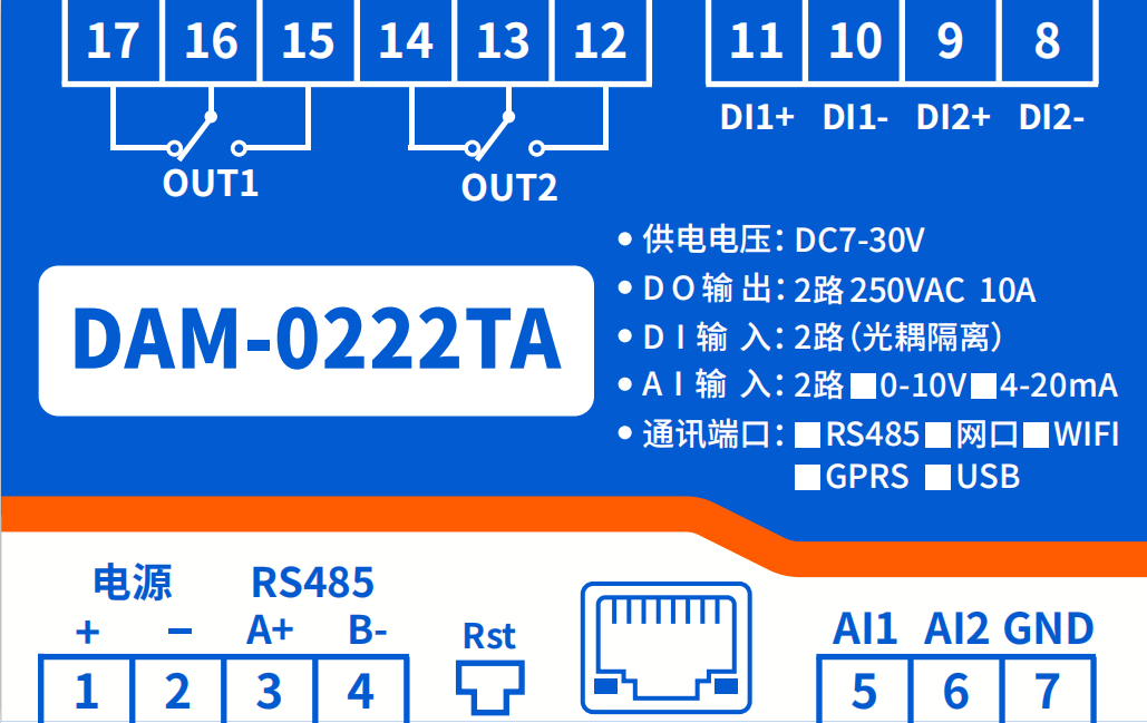 DAM0222TA 工業級網絡模塊,2路繼電器輸出(DO)2路開關量采集(DI)2路模擬量采集(Al),2路繼電器控制輸出,觸點隔離;2路開關量輸入;2路模擬量輸入;支持單網口、單WIFI、網口+WIFI三種分類;支持TCP/UDP工作方式;提供安卓手機APP...