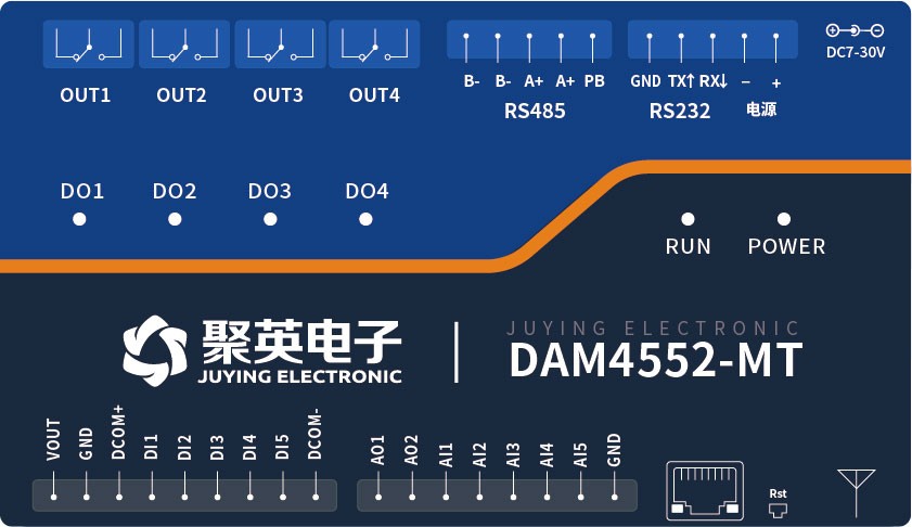 DAM4552-MT 工業級云系列網絡版 4路繼電器輸出(DO)5路開關量采集(DI)5路模擬量采集(AI)2路模擬量輸出(A0),4路繼電器控制輸出,觸點隔離;5路開關量輸入(NPN/干接點);5路模擬量(4-20mA、0-5V、0-10V)輸入;2路模擬量...