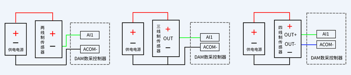下圖中的電源部分為傳感器供電,AI1-AI5接傳感器信號正,ACOM-為傳感器信號負。