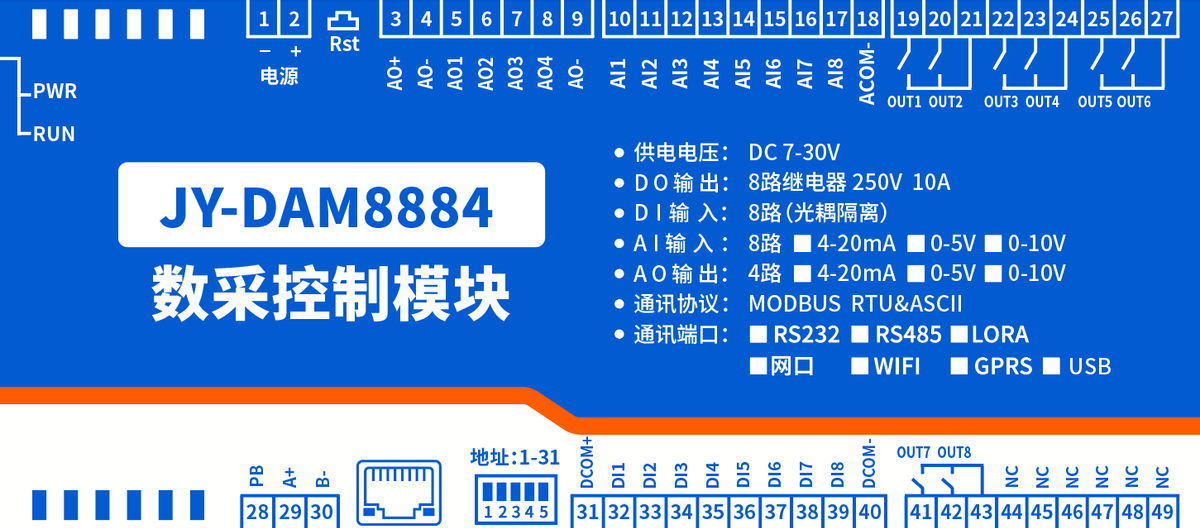 工業級網絡控制模塊 8路繼電器輸出(DO)8路開關量采集(DI)8路模擬量采集(AI)4路模擬量輸出(AO),8路繼電器控制輸出,觸點隔離;8路開關量輸入;8路模擬量輸入;4路模擬量輸出;支持單網口、單WIFl、網口+WIFI三種分類;支持TCP/UDP工作...