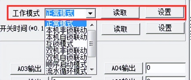 打開“聚英翱翔DAM調試軟件”點擊繼電器模式后面下拉箭頭進行模式的選擇。(后邊時間可自行設置,實際時間=填寫數字*0.1【單位秒】)