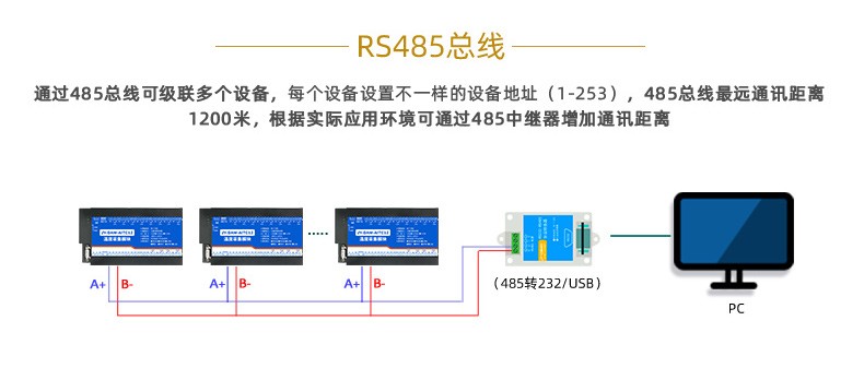 電腦自帶的串口一般是RS232,需要配232-485轉換器(工業環境建議使用有源帶隔離的轉換器),轉換后RS485為A、B兩線,A接板上A端子,B接板上B端子,485屏蔽可以接PB。若設備比較多建議采用雙絞屏蔽線,采用鏈型網絡結構。