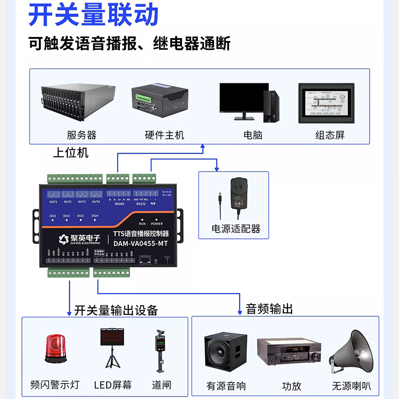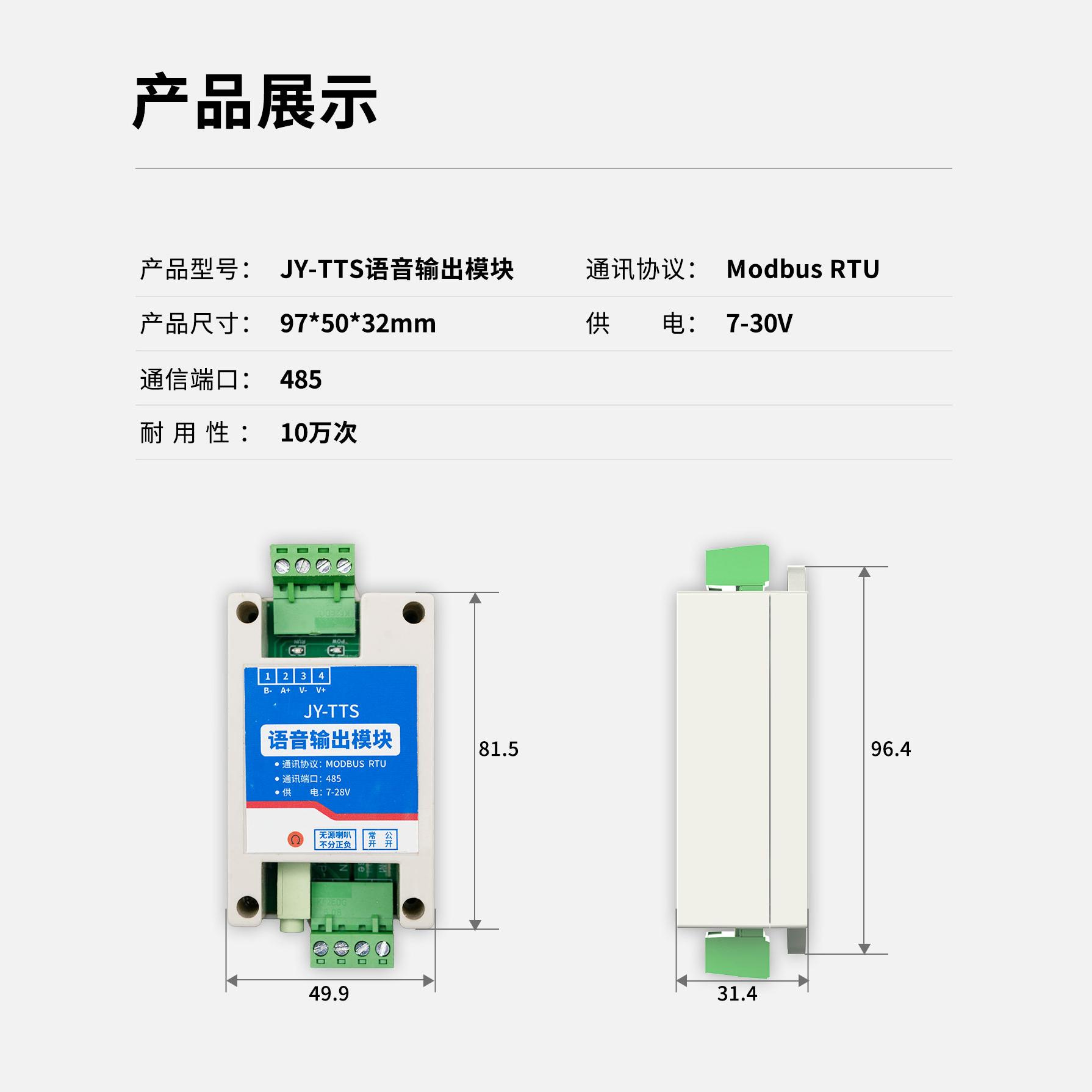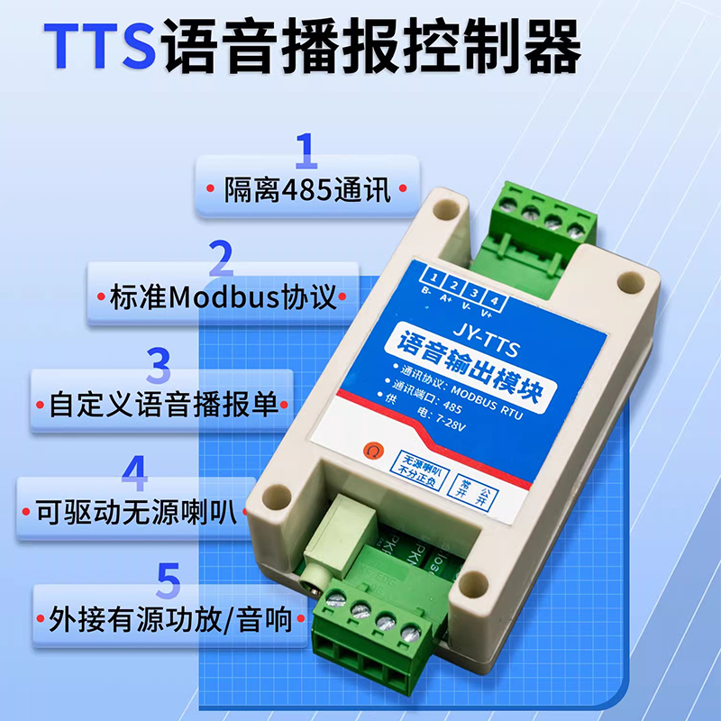 JY485-TTS 模塊是一款高性能的文本語音合成模塊,集成了485 通訊接 口,遵循Modbus 通信協議,該模塊支持個性化配置,包括單條語音的音量、音色及語速調整,滿足多樣化的應用場景需求。同時能夠同時保存多條語音信息。此外, JY485-TTS 模塊采用虛擬 Do 觸發機制,進一步提升了操作的便捷性和響應速度。